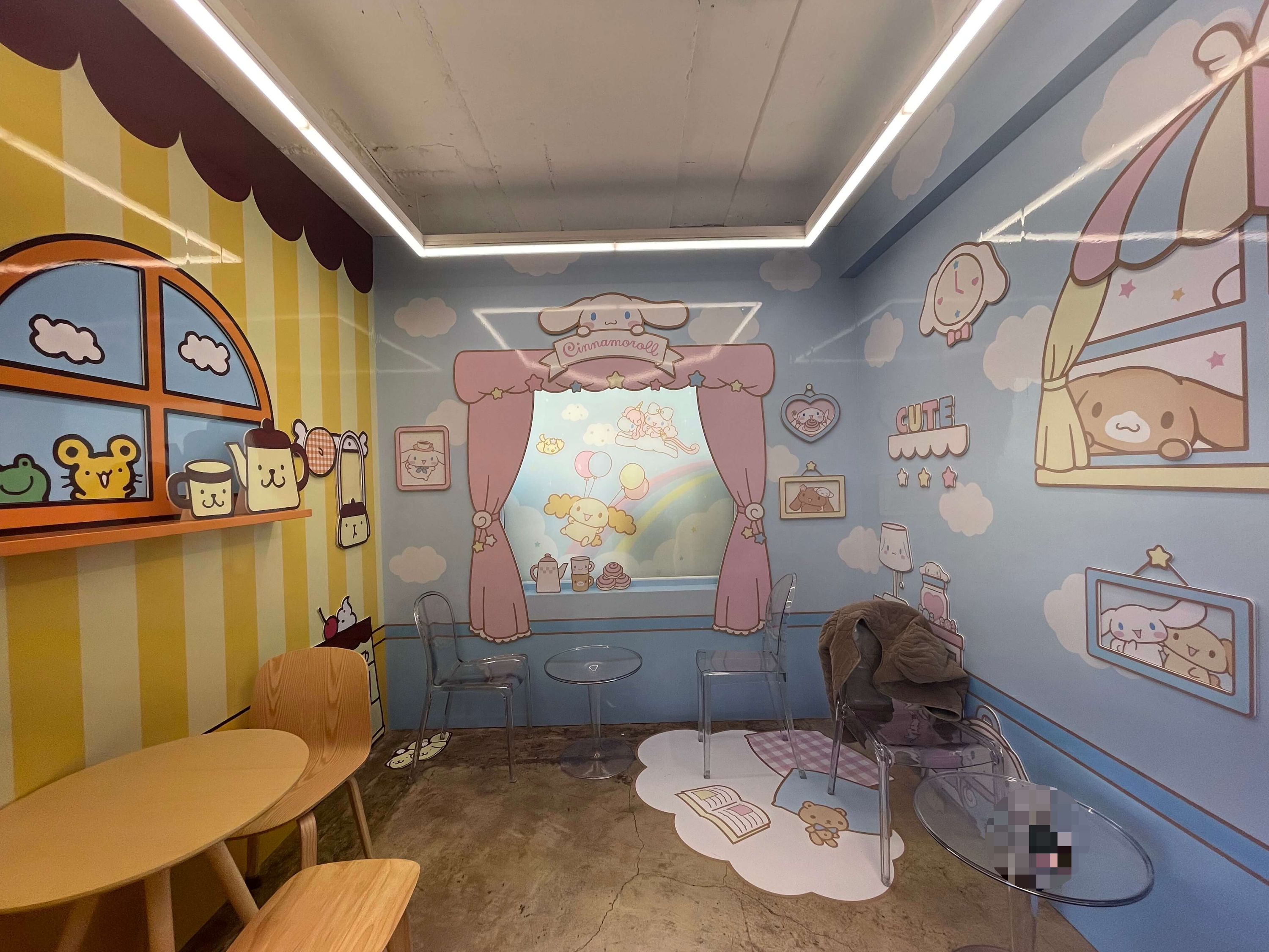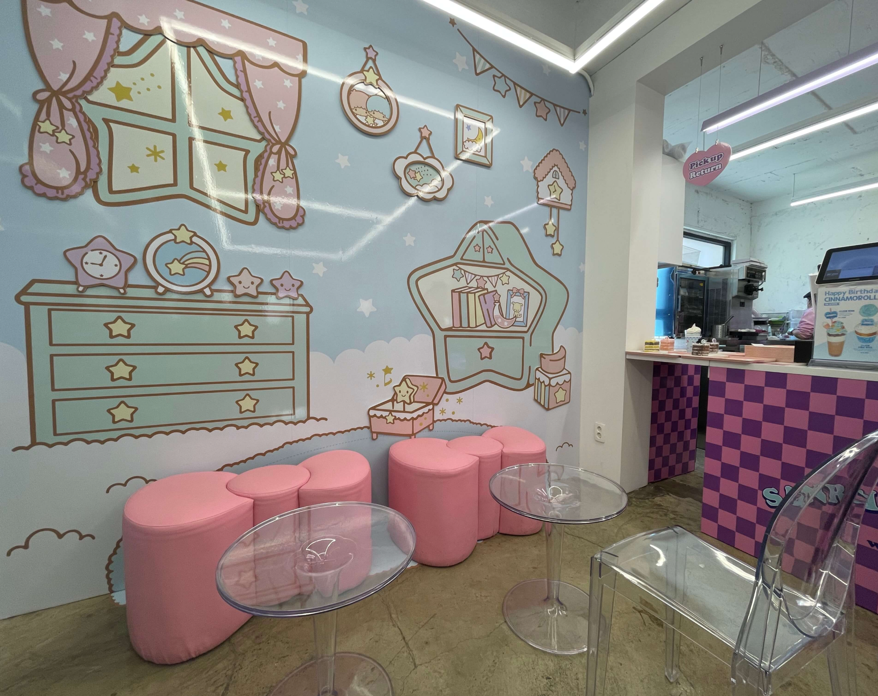 카페 건물 옆이 우 1 치안센터여서 길 찾기 쉬웠습니다. 입구에 오면 화려한 색감으로 산리오카페임을 보여줍니다.