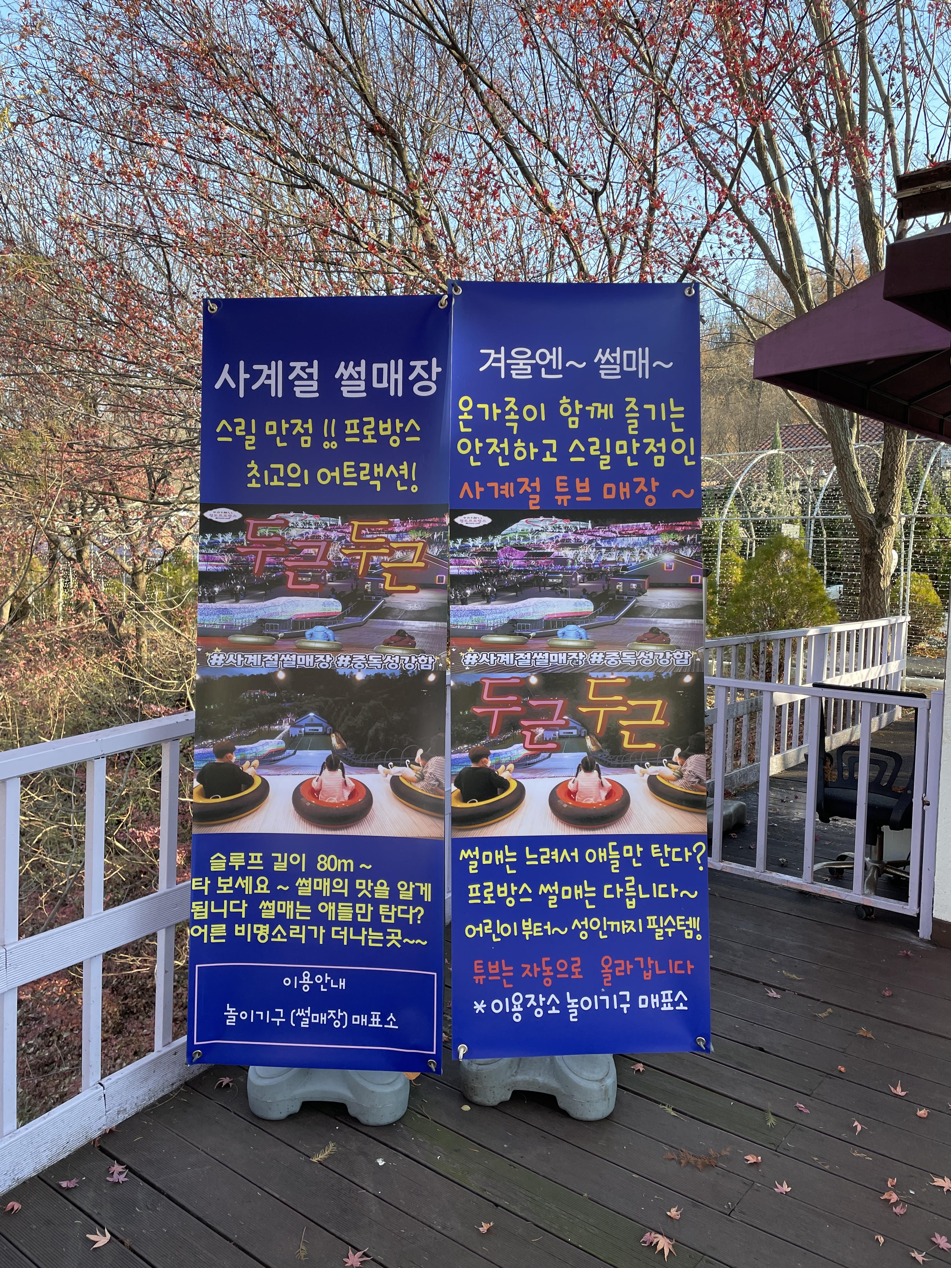 토요일에 가서 세시가 안되어서 도착을 했었는데 썰매장은 3시부터 운영한다고 해서 조금 기다렸다가 탔어요. 주말이어도 어두워지기 전이라 그런지 사람이 많지는 않아서 처음엔 편하게 탔는데 어두워졌을 때도 타보자고 해서 조금 후에 타려고 갔더니 줄이 엄청 기네요~