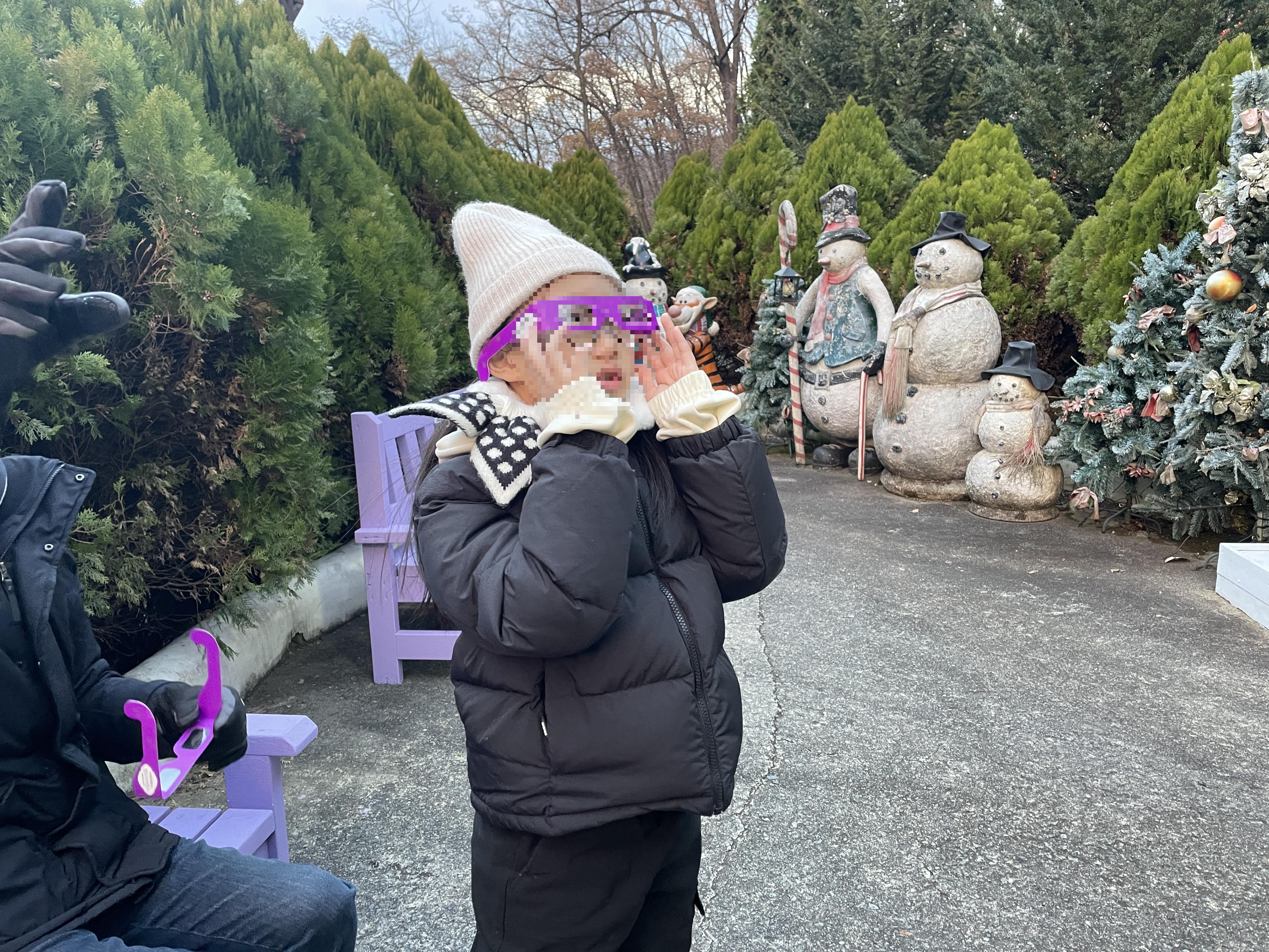주차하고 오르막길 오르면 끝에 매표소가 있어요. 앞쪽의 키오스크에서 예매한 표 발권하거나 현장발권하고 직원에게 보여주면 이런 보라색 안경을 나눠줍니다. 이건 나중에 불이 켜지면 끼고 보면 된다고 하네요